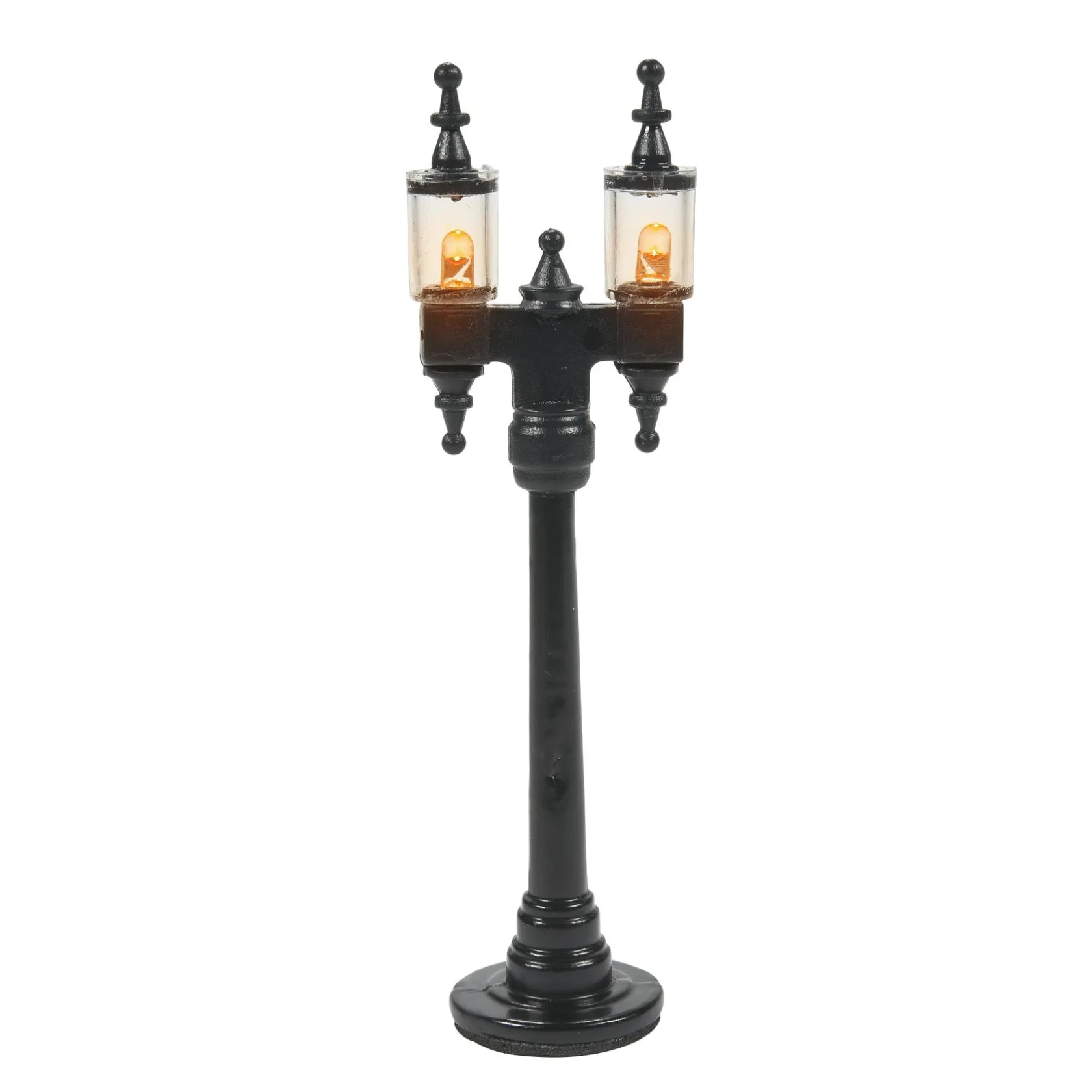 A double set of lights to line the sidewalks and streets of your village. Set includes 4 lamp posts. Battery operated (use 2 C batteries, not included) but also works with 56.55026 Adapter or 56.53500 Lighting System.