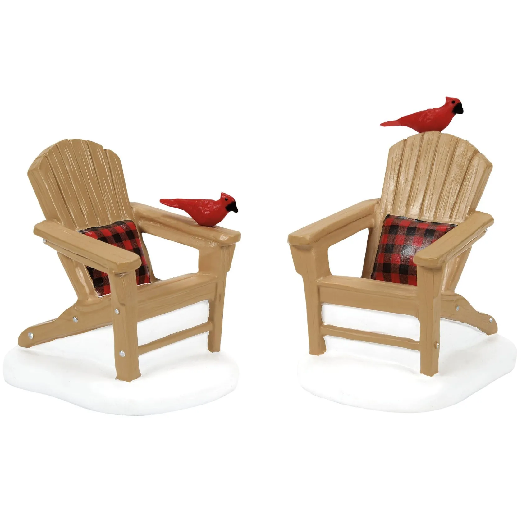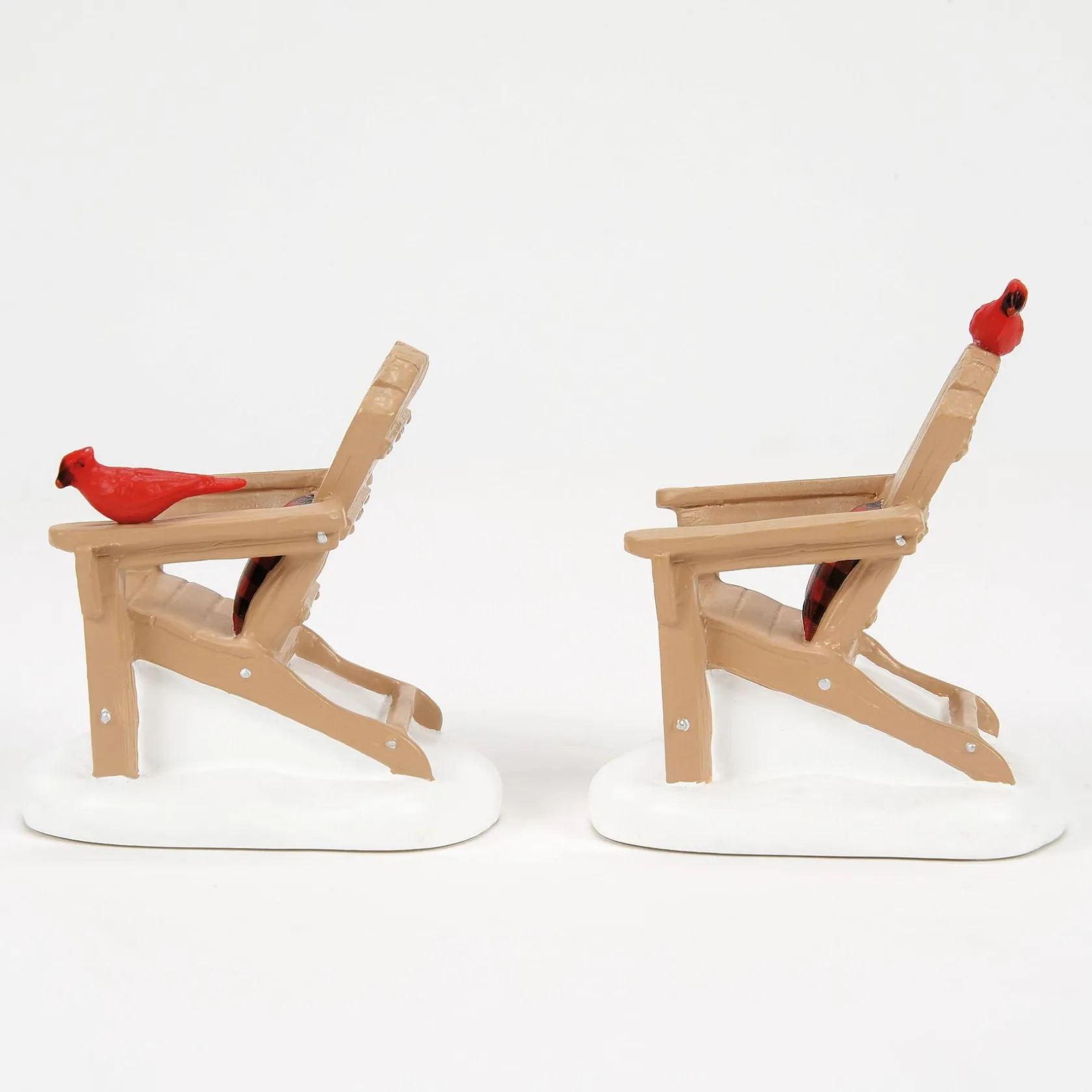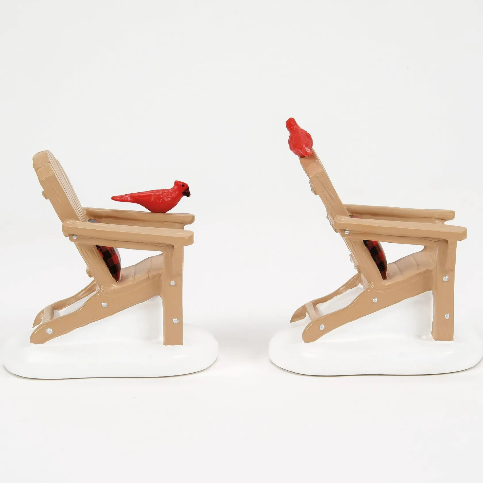 Two cardinals rest their wings as they sit a spell on a pair of Adirondack chairs.