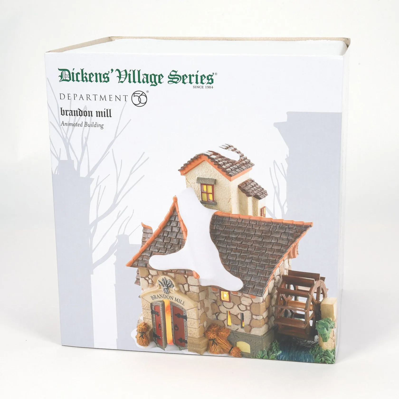 Part of the Dickens’ Village Series from Department 56. Victorian England, where many traditions we celebrate today took shape. The miller at Brandon Mill ground corn for his neighbors. Hand-crafted & hand-painted porcelain lit building.