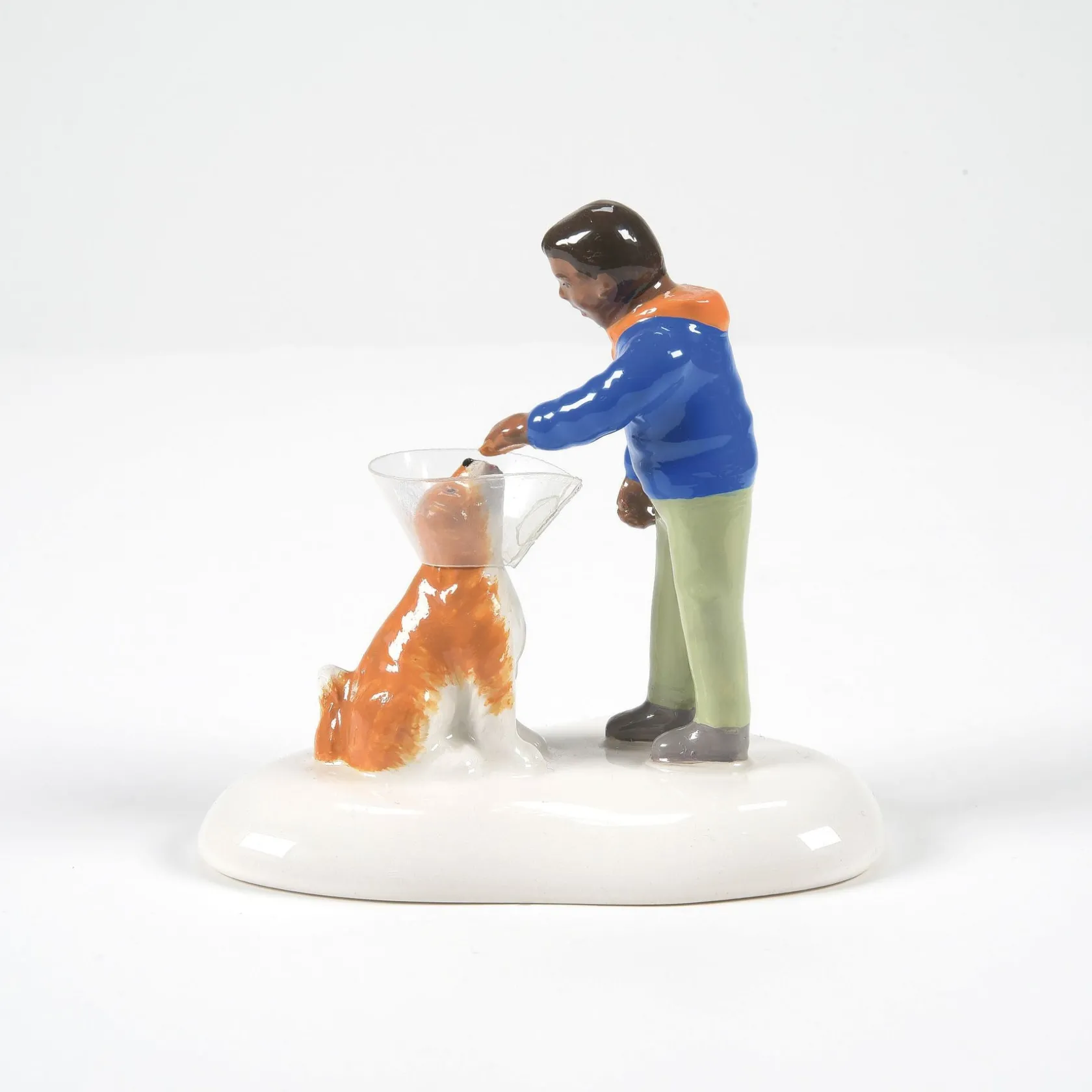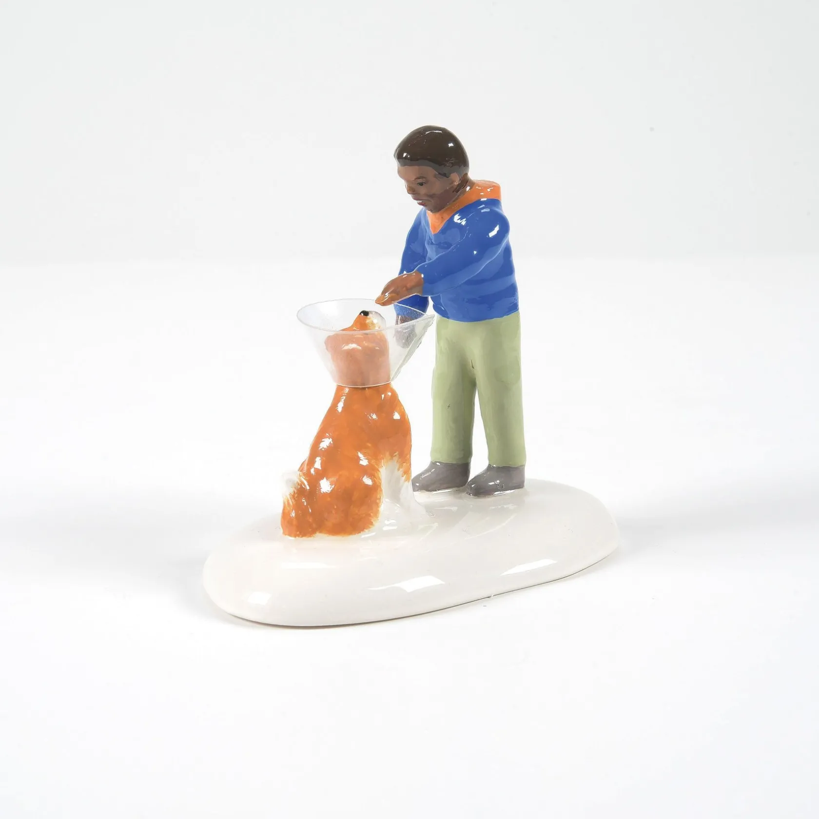 A young boy convincing his puppy that they can, indeed, wait 2 more days to get that cone removed. It will be the best Christmas ever!