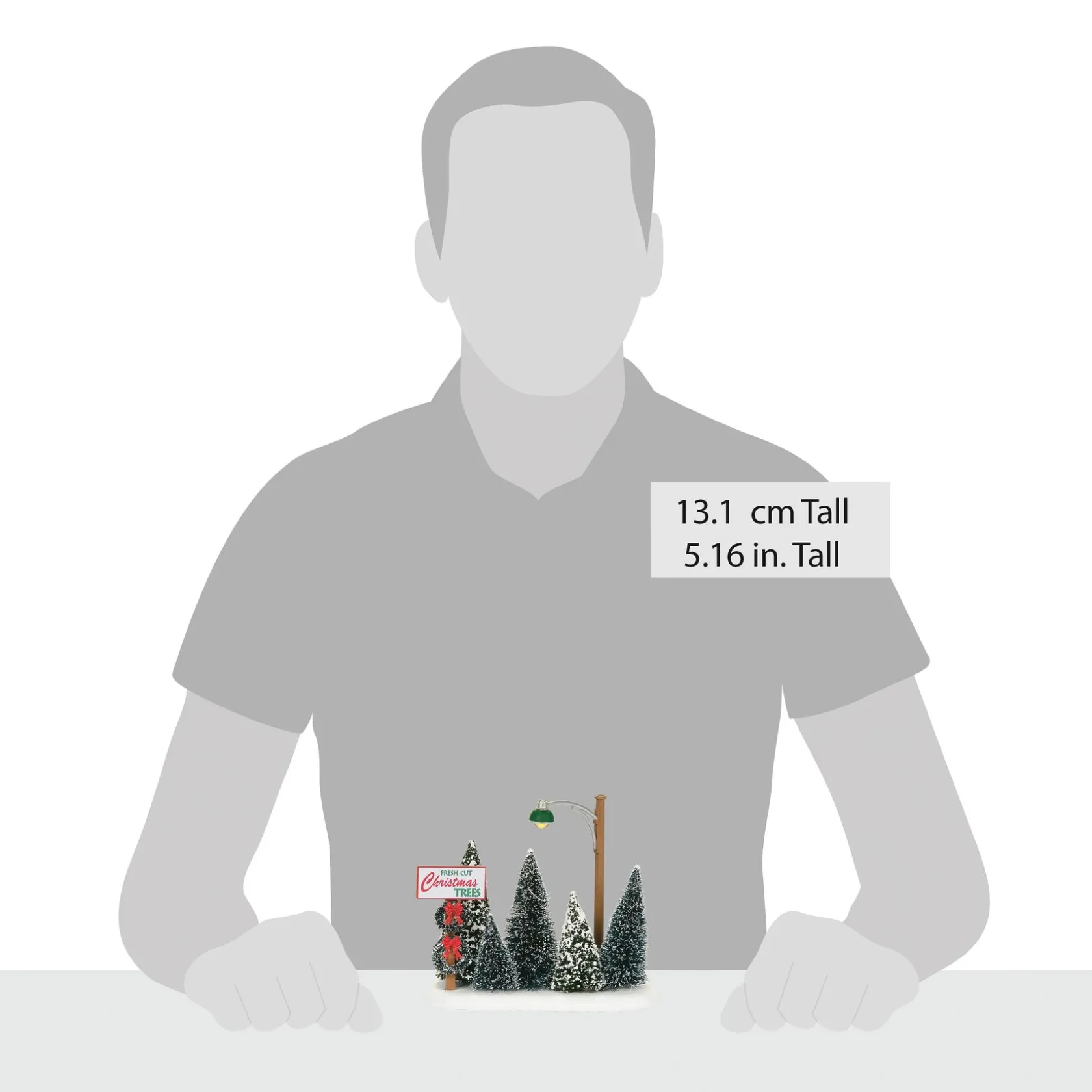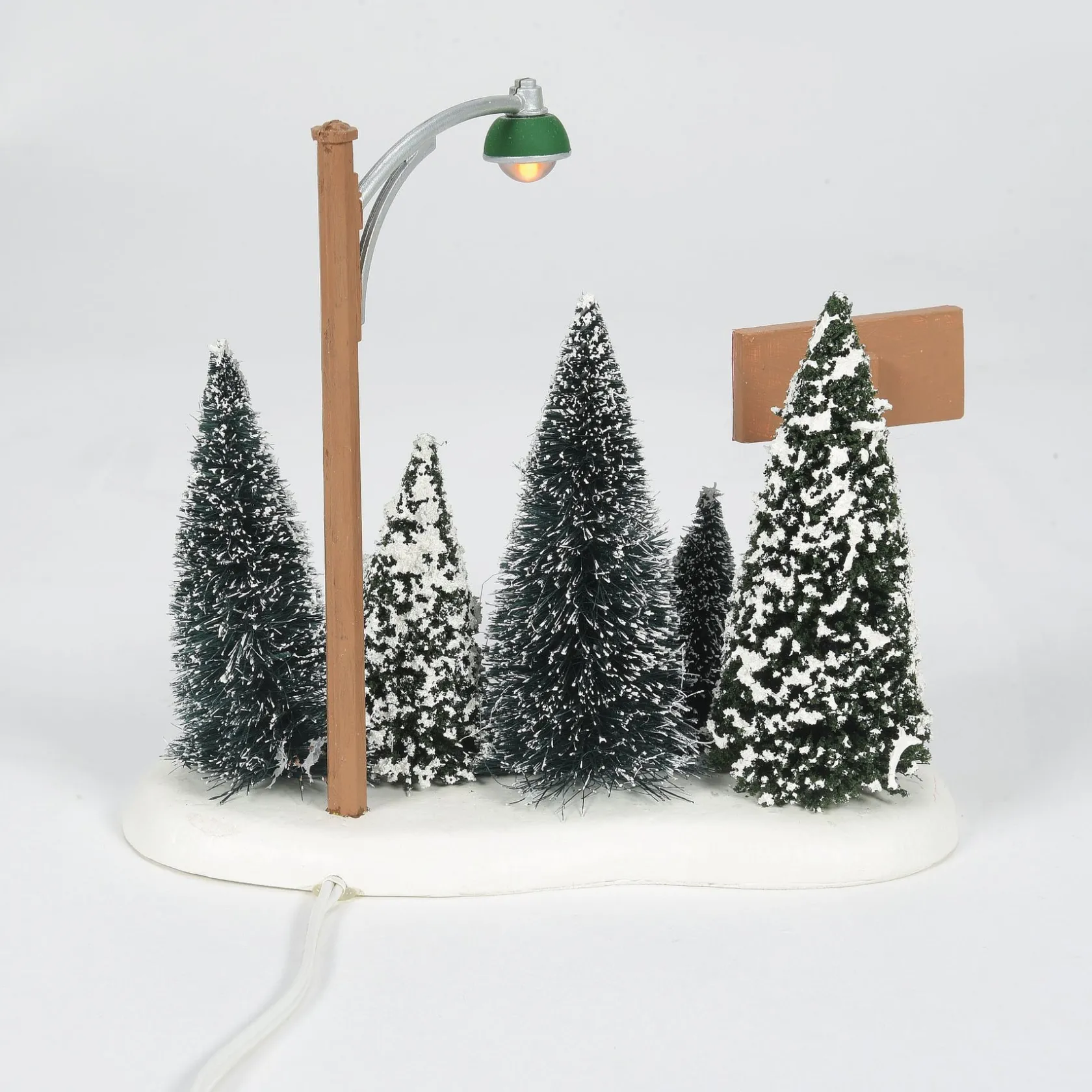 A Balsam Fir, Long Needle Pine or Fraser Fir? This corner tree lot is lit by an old fashioned street light. A great accessory to add to any Village scene, and they sell wreaths, too!