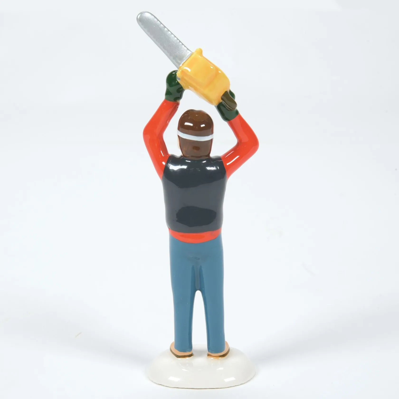 Armed with a chain saw, protected with his hockey mask, Clark is ready to trim the tree.