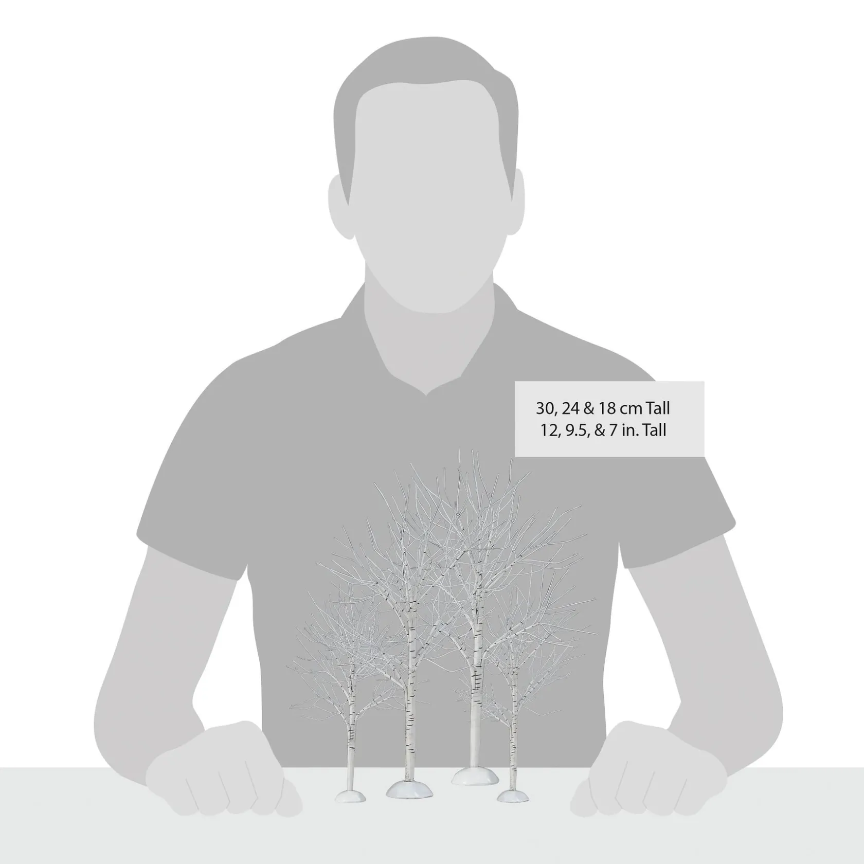 A set of six trees in 12″, 9.5″ and 7″ sizes that bend to your needs. Use Department 56 Cross Product accessories to enhance your Village display.
